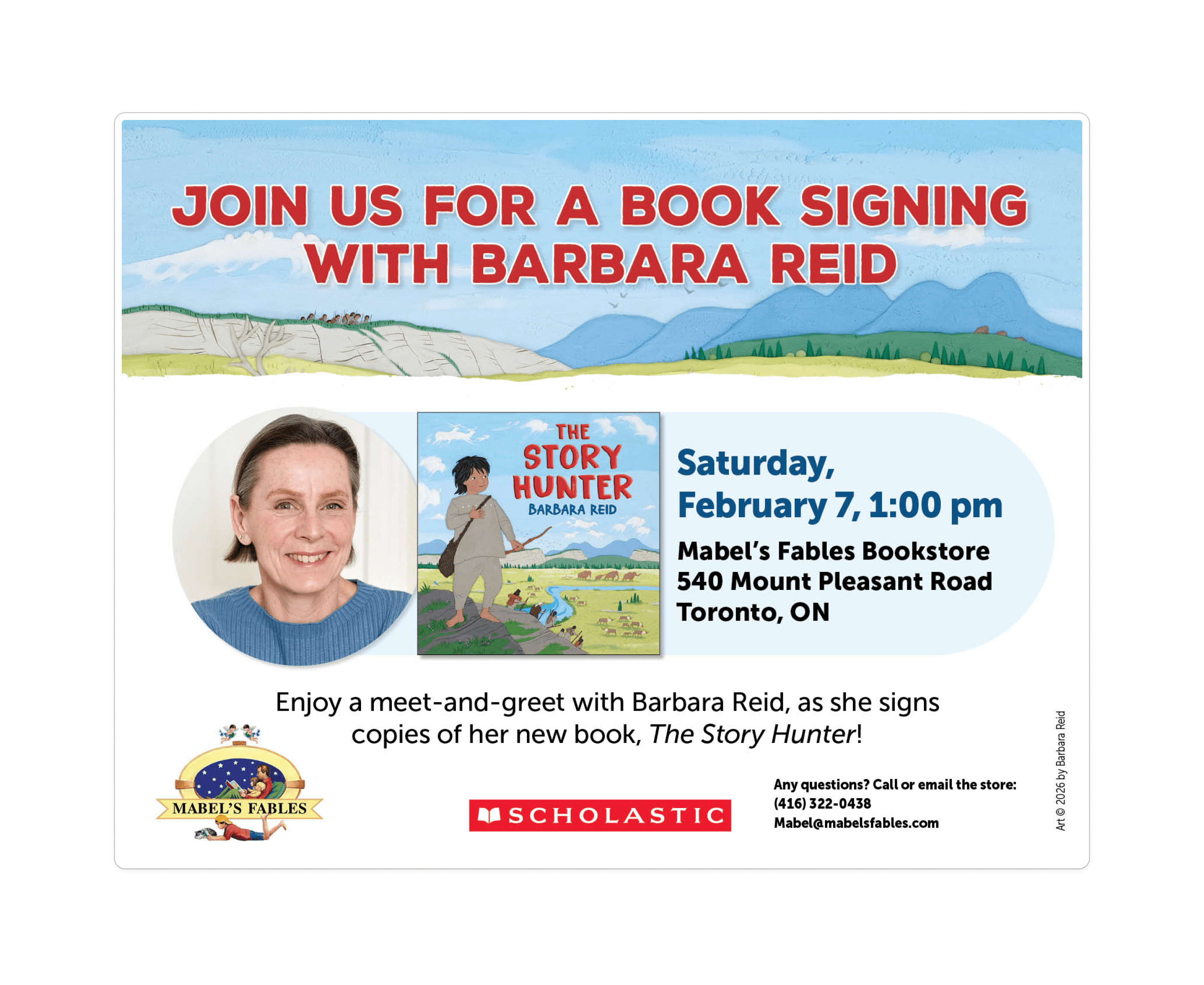 Designed for families and student fans, join Barbara Reid for a book signing for her newest title, The Story Hunter, on Saturday, February 7, 2026 at 1:00 PM at the beloved independent Mabel's Fables Children's Bookstore, in the heart of Davisville Village in midtown Toronto (540 Mount Pleasant Road, Toronto, ON M4S 2M5). The bookstore is a favourite with local Toronto families, walkable from nearby neighbourhoods including Moore Park, Summerhill, and Rosedale, and just a short trip from The Annex, Leaside, and Yonge & Eglinton.